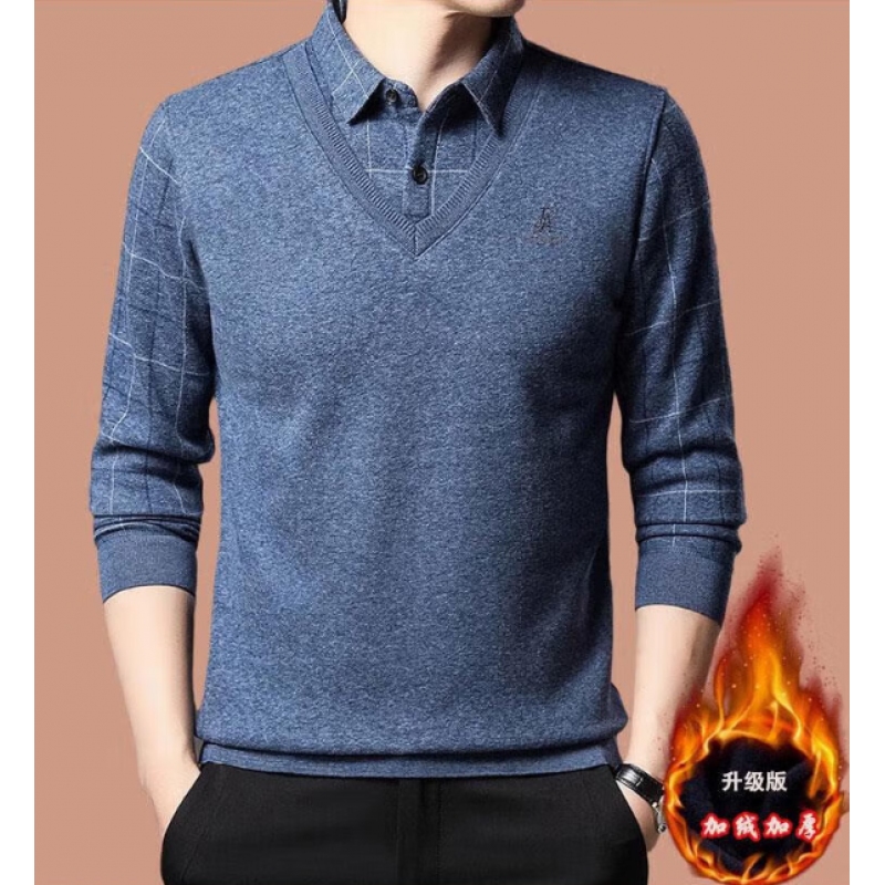 Woolen sweater, fake two-piece design with added fluff, men's thickened sweater for autumn and winter, warm and thickened sweater